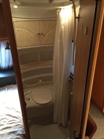 Rozkládací sezení do ,,U", velká francouzská postel, kuchyň, WC se sprchovou, umyvadlo zvlášť.