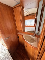 Velké rozkládací sezení ve tvaru U, velká francouzská postel, kuchyň, WC se sprchou, umyvadlo zvlášť