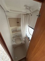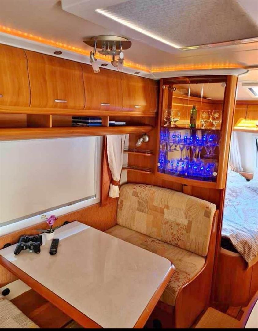 Rozkládací boční sezení, velká francouzská postel, palandy, kuchyň, WC se sprchou , toaletní koutek