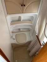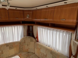 Velké rozkládací sezení ve tvaru U, velká francouzská postel, kuchyň, WC se sprchou a sprchovou vaničkou, umyvadlo zvlášť.