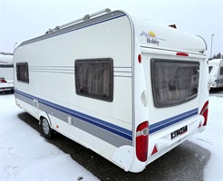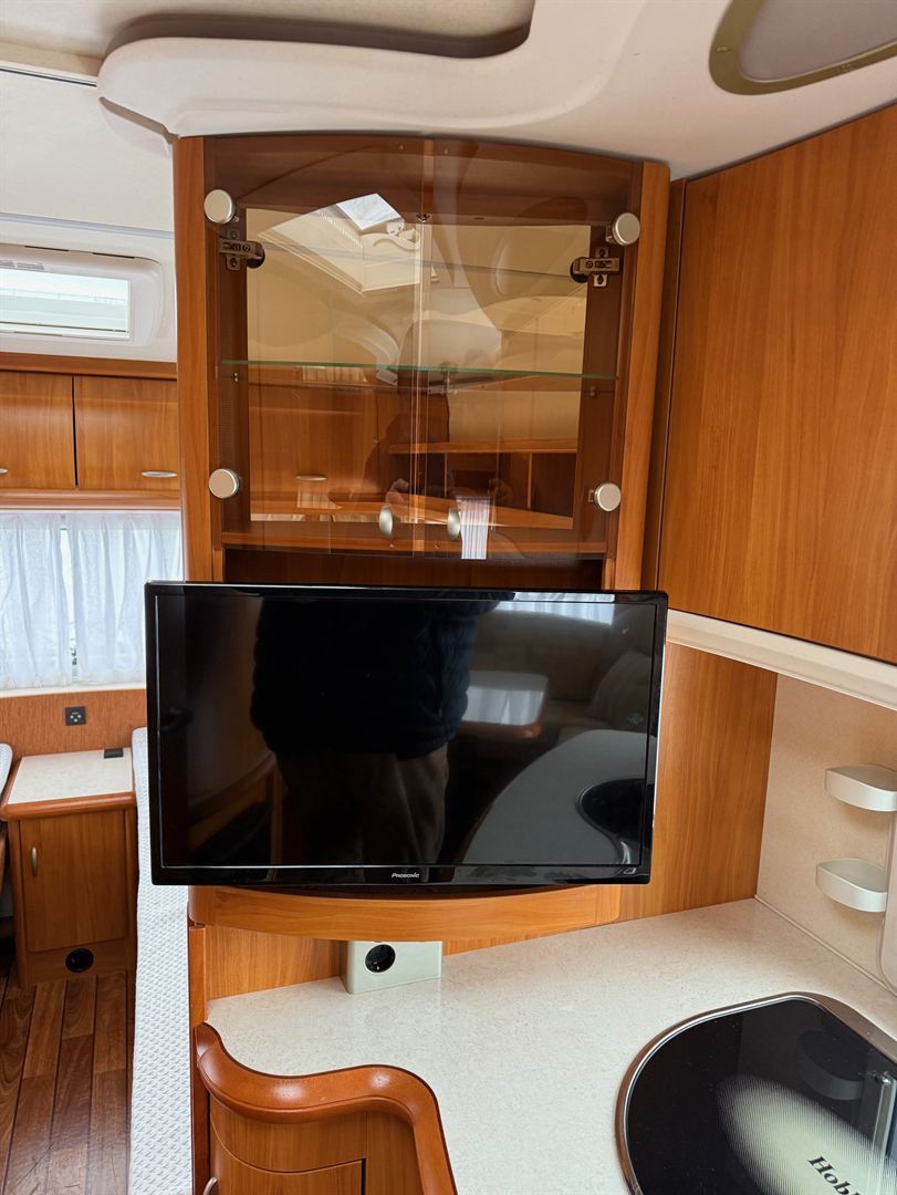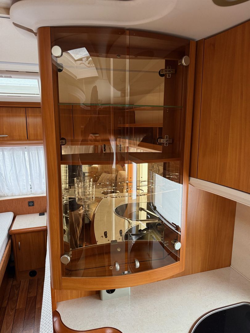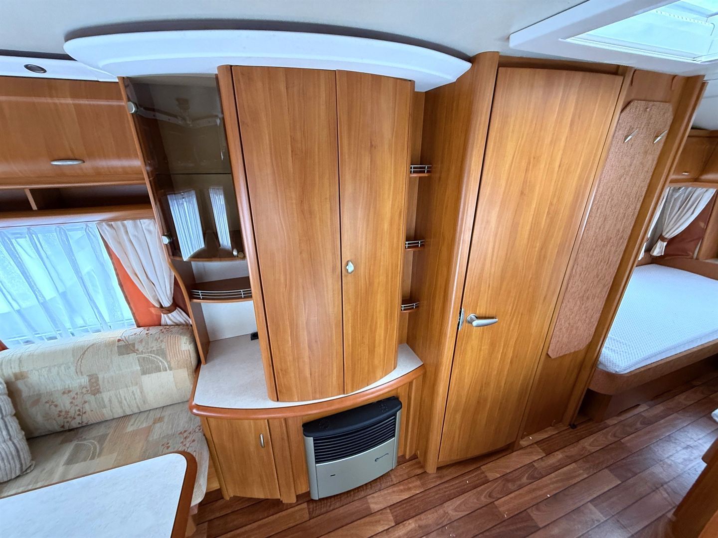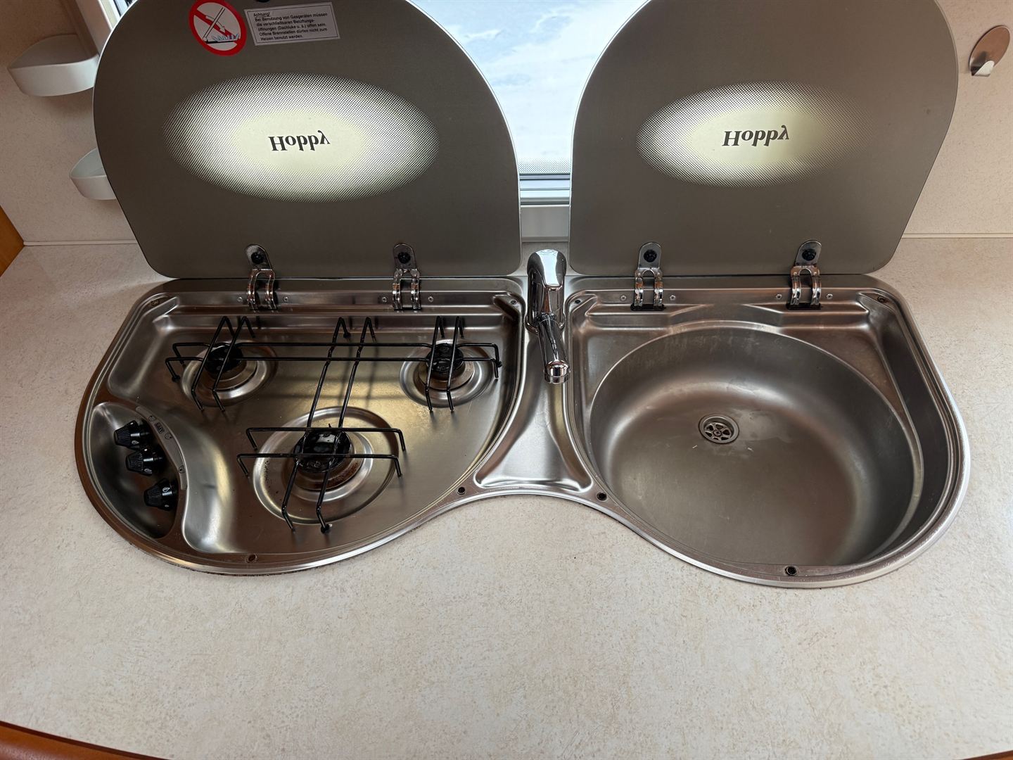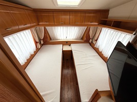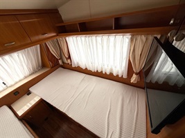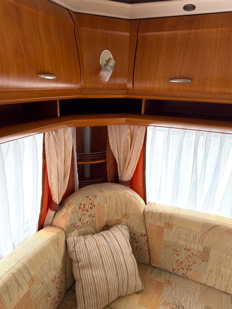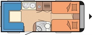 Rozkládací sezení ve tvaru U, dvě oddělené postele, kuchyň, WC s umyvadlem,