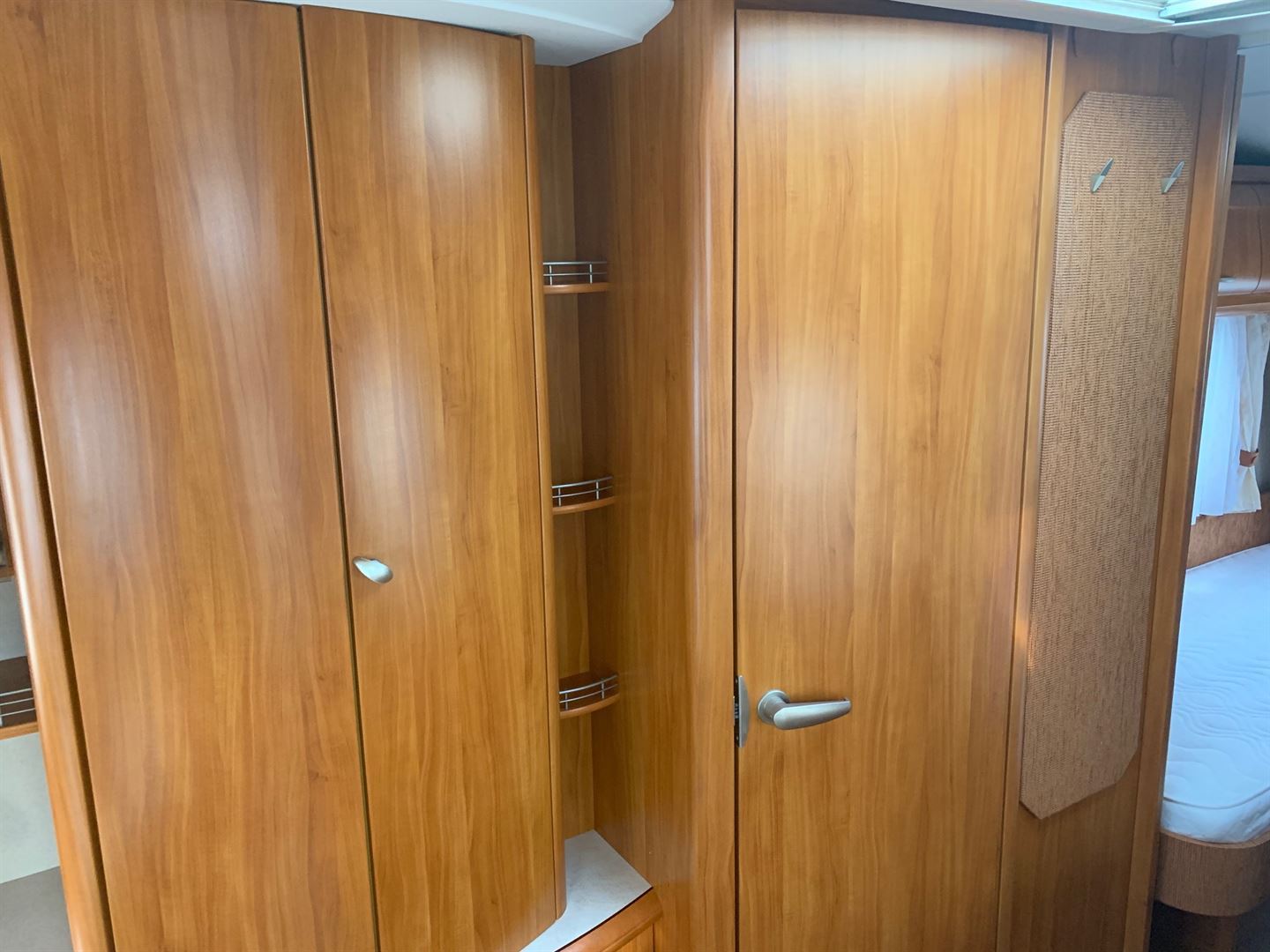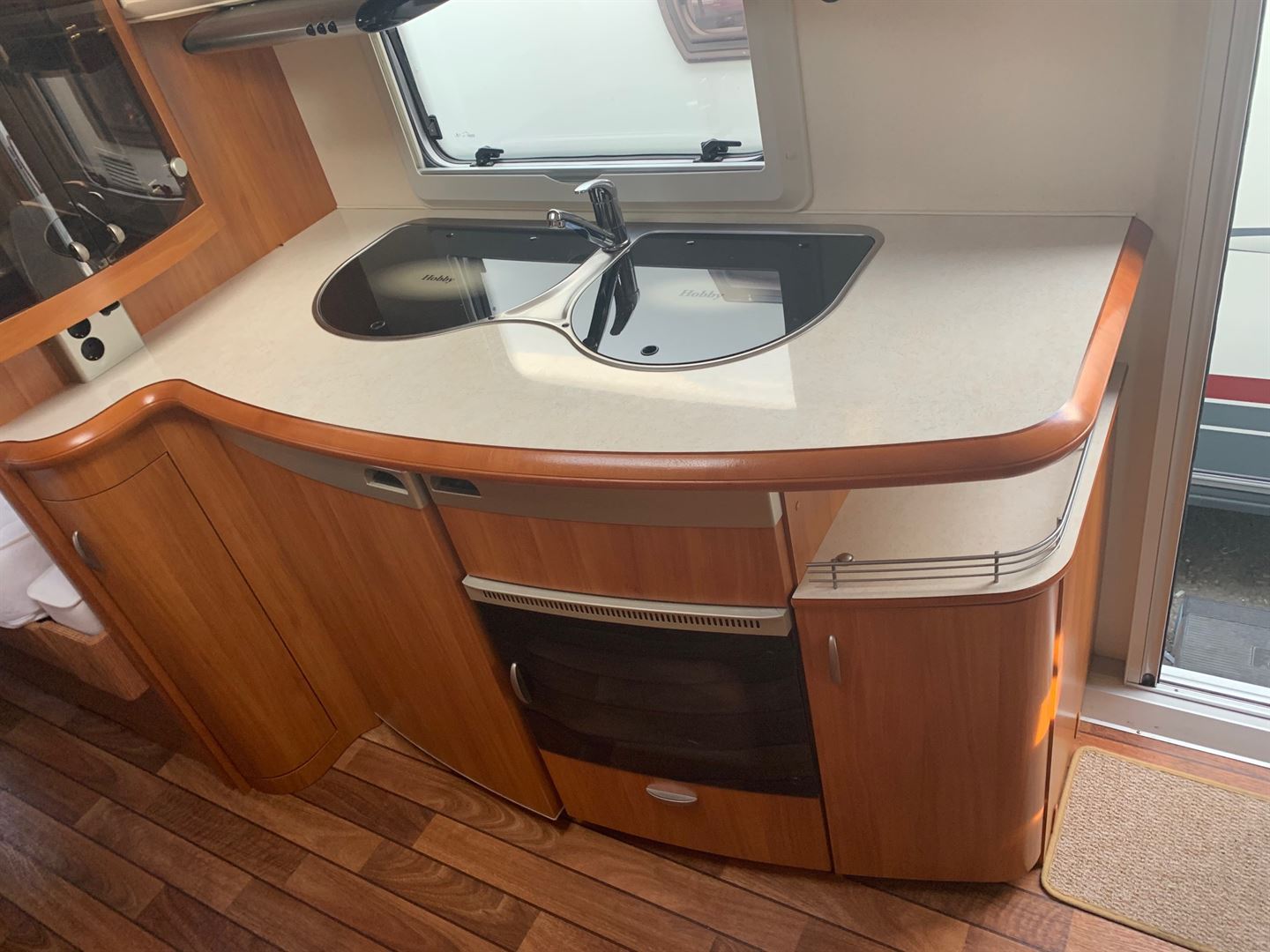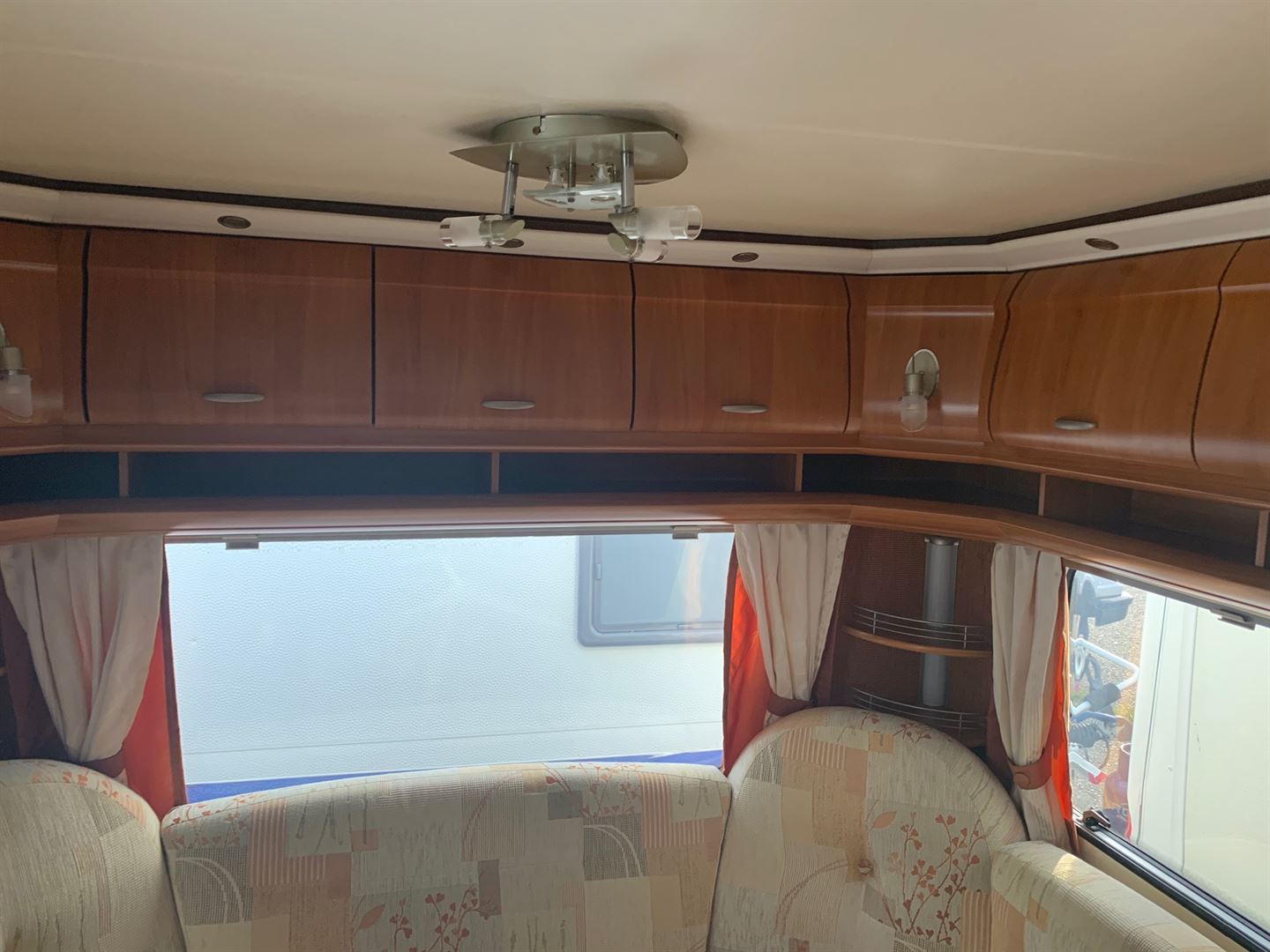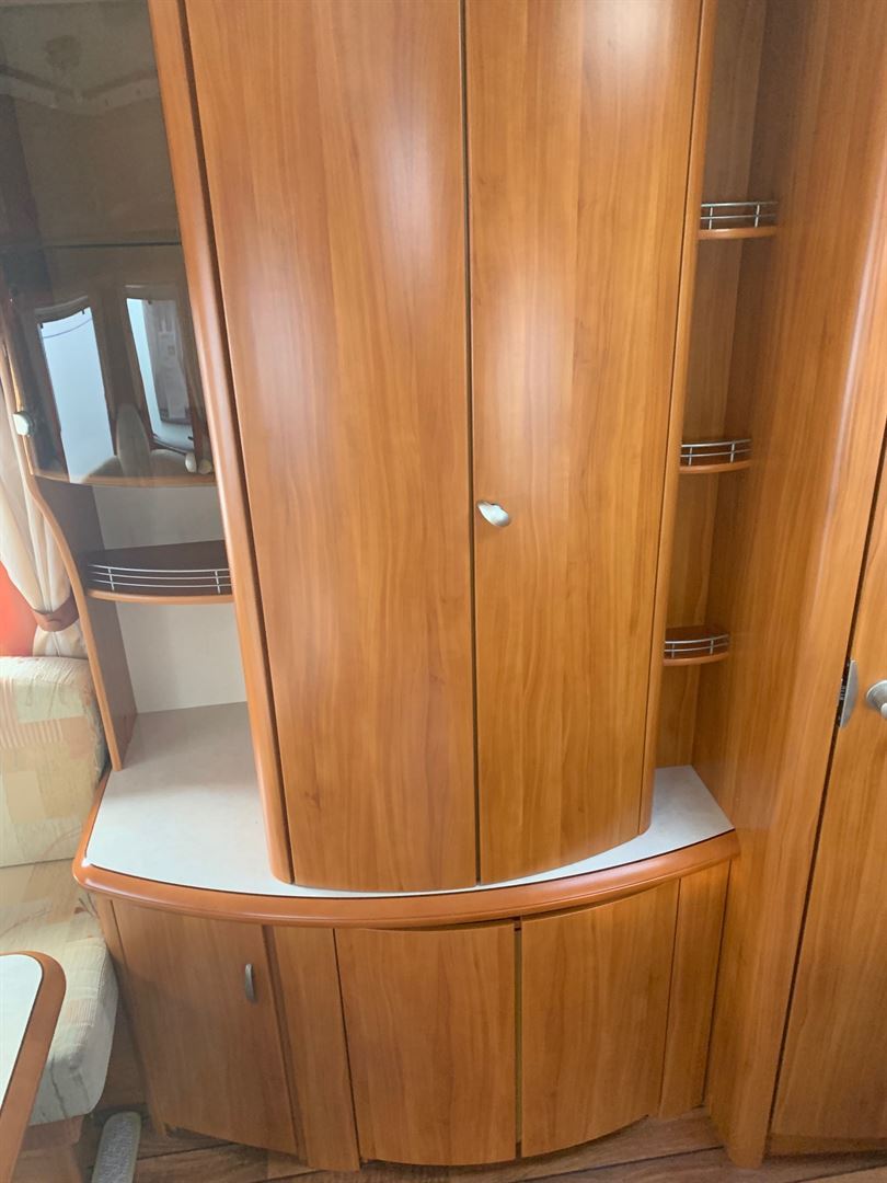 Rozkládací sezení ve tvaru U, dvě oddělené postele (možnost dokoupení roštu pro vytvoření velkého letiště), kuchyň, WC s umyvadlem