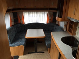 Rozkládací sezení do ,,U", 2 oddělené postele (možnost objednání mezikusu pro vytvoření velké postele), kuchyň, WC se sprchou a umyvadlem.