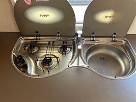Rozkládací sezení ve tvaru U, dvě oddělené postele, kuchyň, WC s umyvadlem,