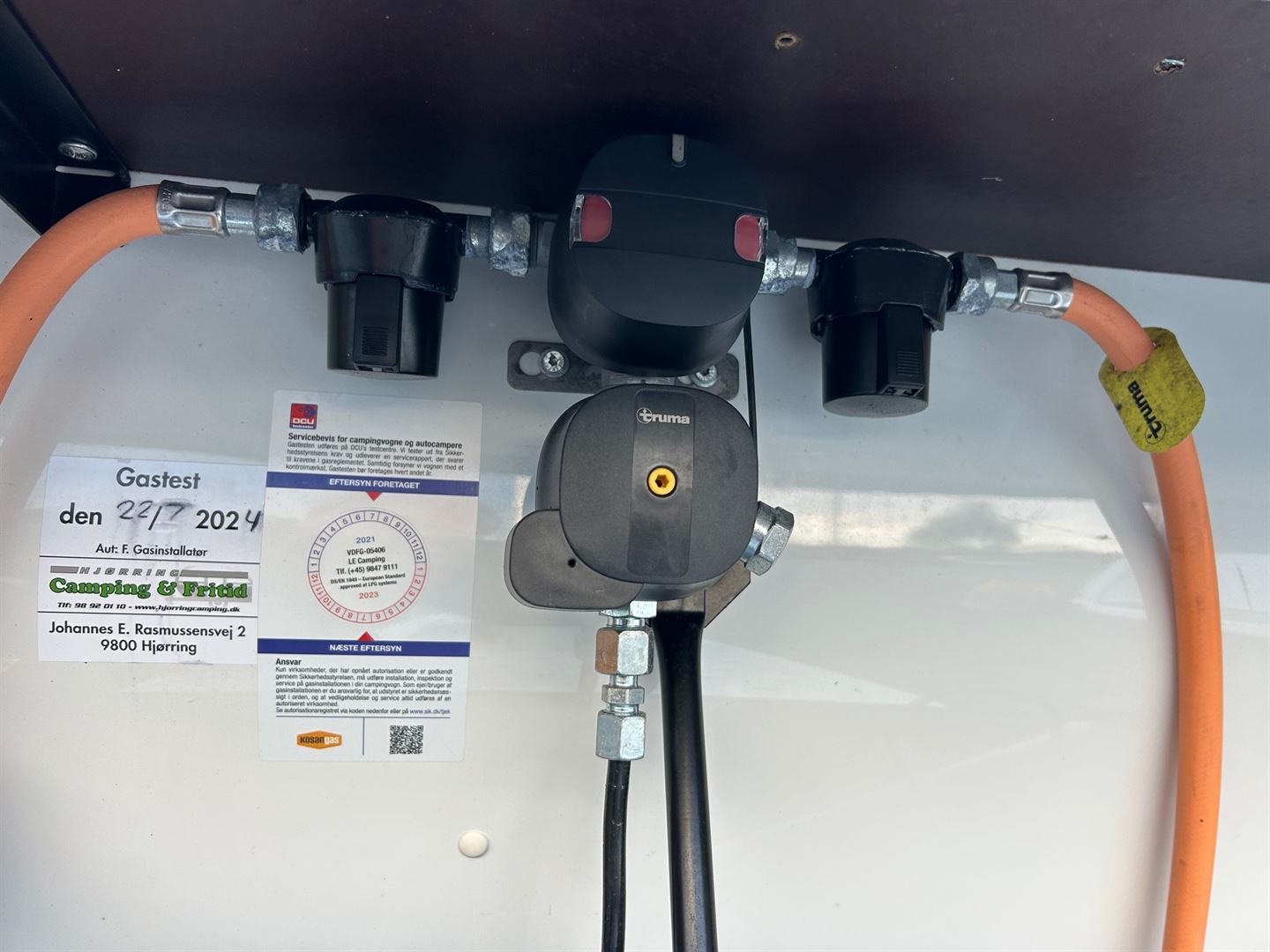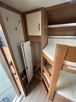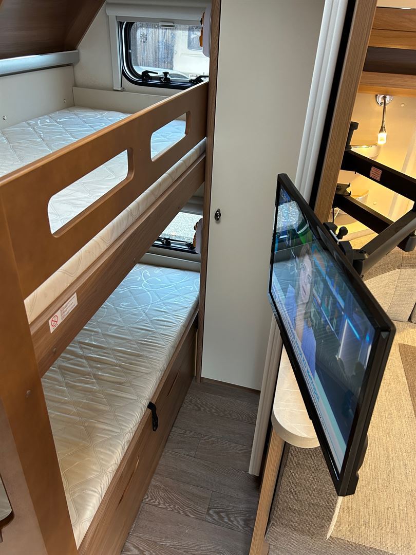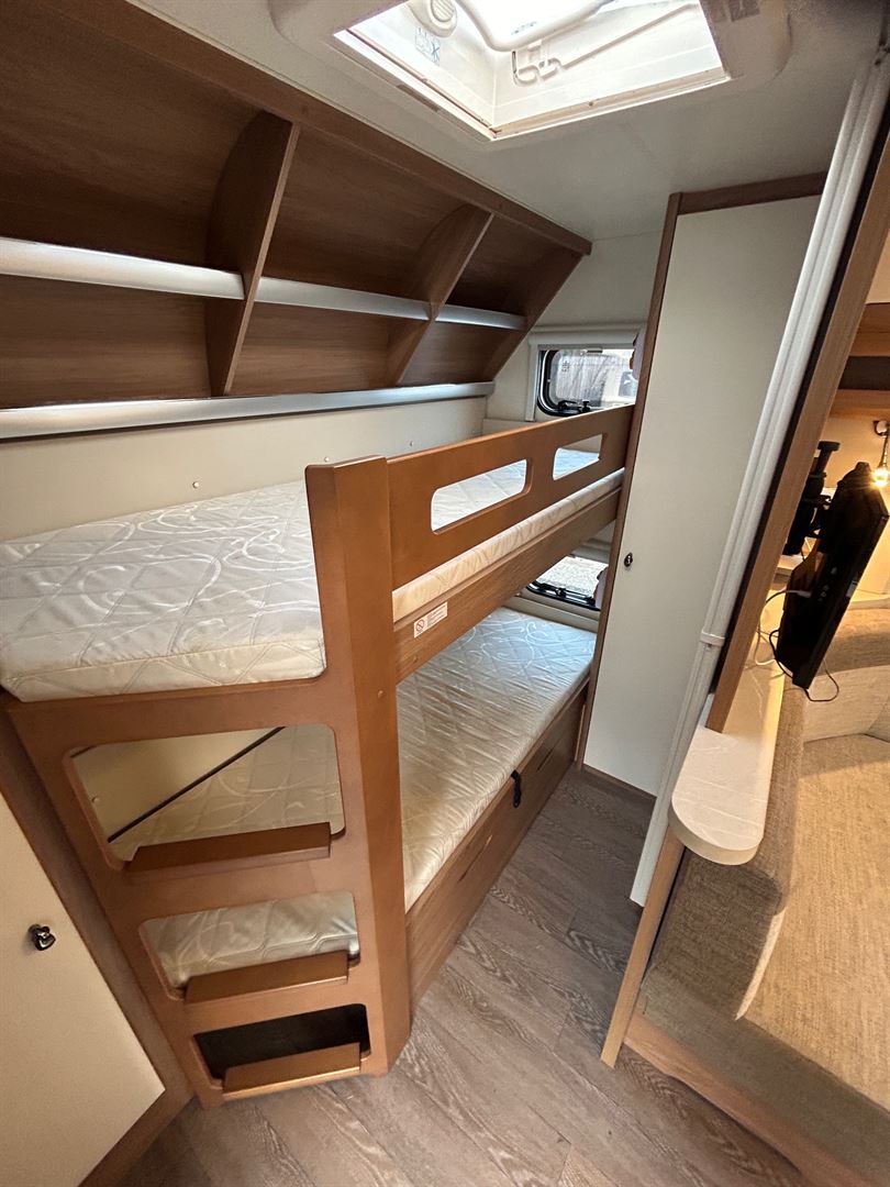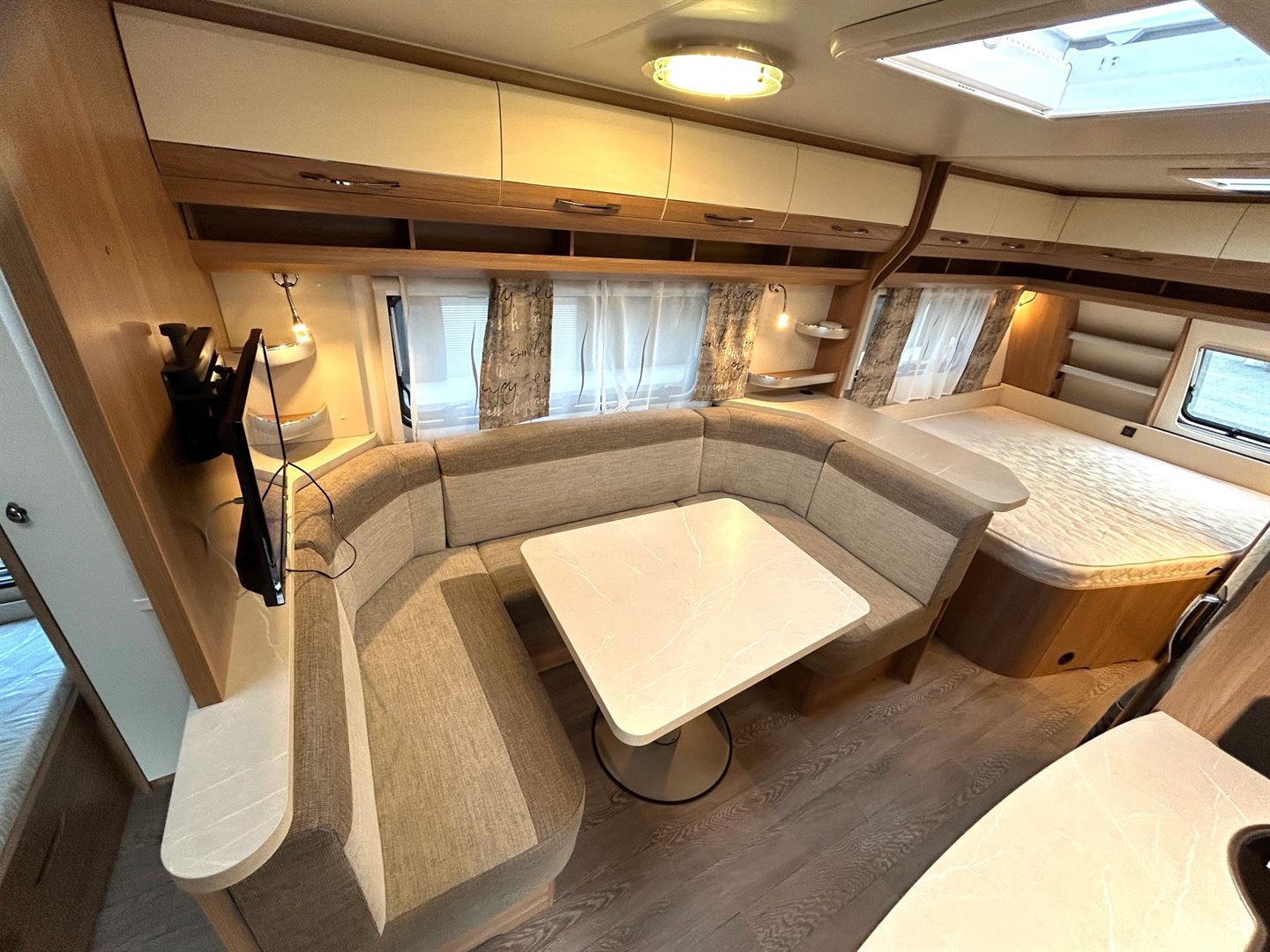 Velké rozkládací sezení ve tvaru U, francouzská postel, palandy s žebříkem, kuchyň, WC se sprchou, toaletní koutek - umyvadlo zvlášť