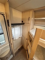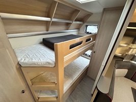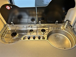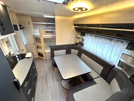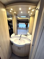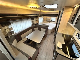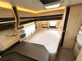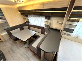Rozkládací sezení ve tvaru U, velká francouzská postel, zadní palandy, kuchyň, WC se sprchovou vaničkou, umyvadlo zvlášť.