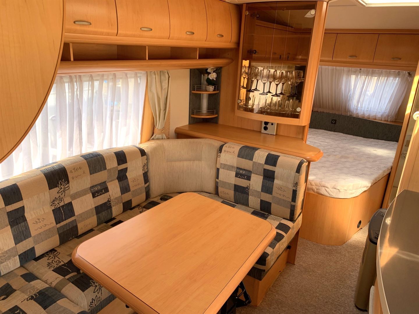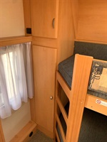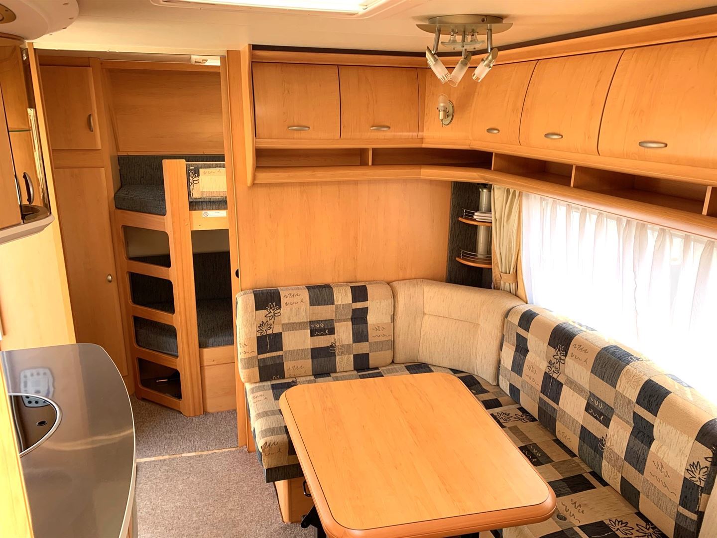 Velké rozkládací sezení ve tvaru U, francouzská postel, palandy s žebříkem, kuchyň, WC se sprchou, toaletní koutek
