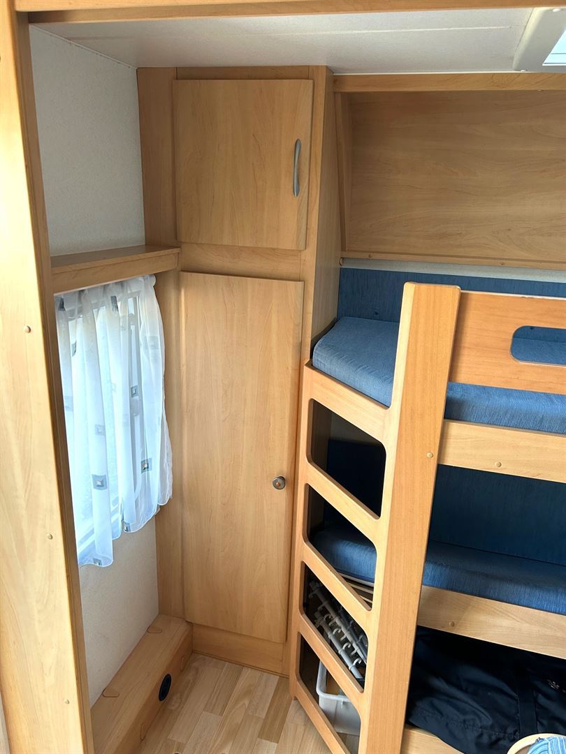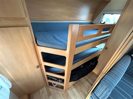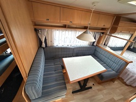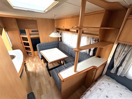 Velké rozkládací sezení ve tvaru U, francouzská postel,2 x palandy s žebříkem, kuchyň, WC se sprchou, toaletní koutek