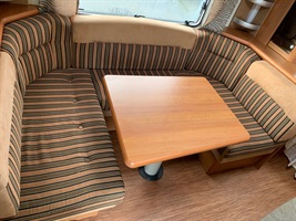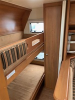 Velké rozkládací sezení ve tvaru U, francouzská postel, palandy s žebříkem, kuchyň, WC se sprchou, toaletní koutek