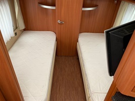 Velké rozkládací sezení ve tvaru U, dvě oddělené postele, kuchyň, zadní koupelna- WC, umyvadlo, plnohodnotný samostatný sprchový kout