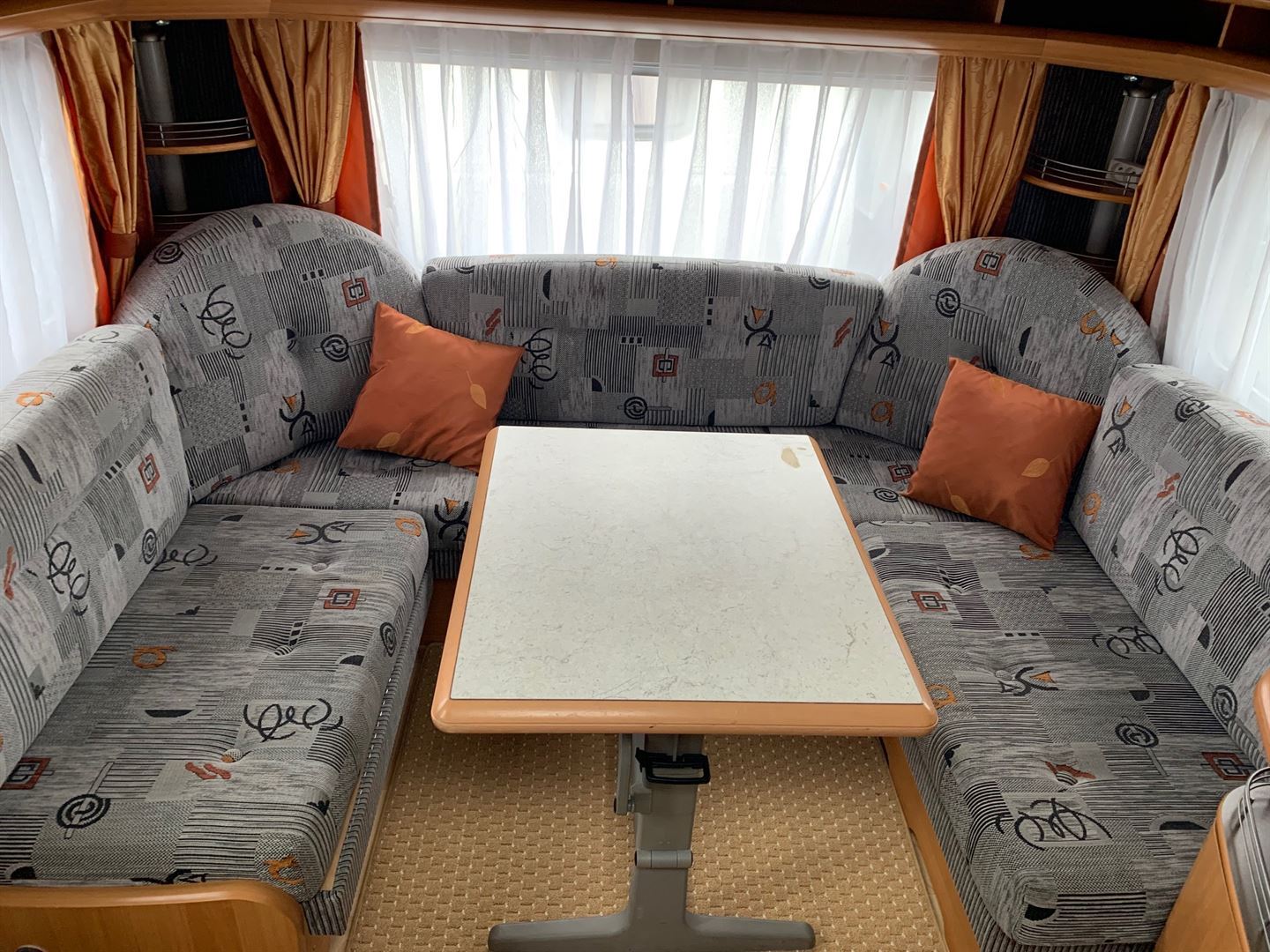 Velké rozkládací sezení do ,,U", ložnice s manželskou postelí, pokojíček- palanda + rozkládací boční sezení, kuchyň, WC, umyvadlem zvlášť