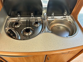 Rozkládací boční sezení, francouzská postel, kuchyň, WC s umyvadlem