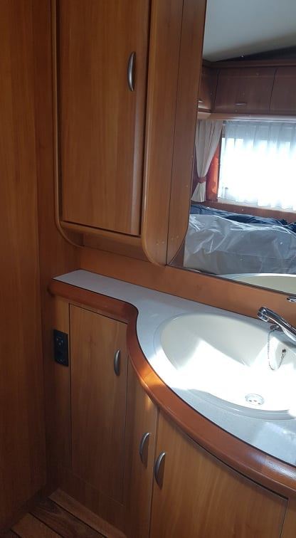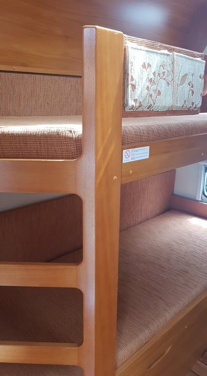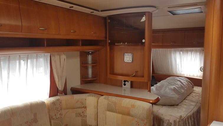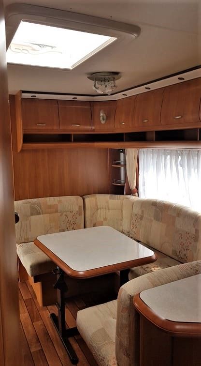 Velké rozkládací sezení ve tvaru U, francouzská postel, palandy s žebříkem, kuchyň, WC se sprchou, toaletní koutek