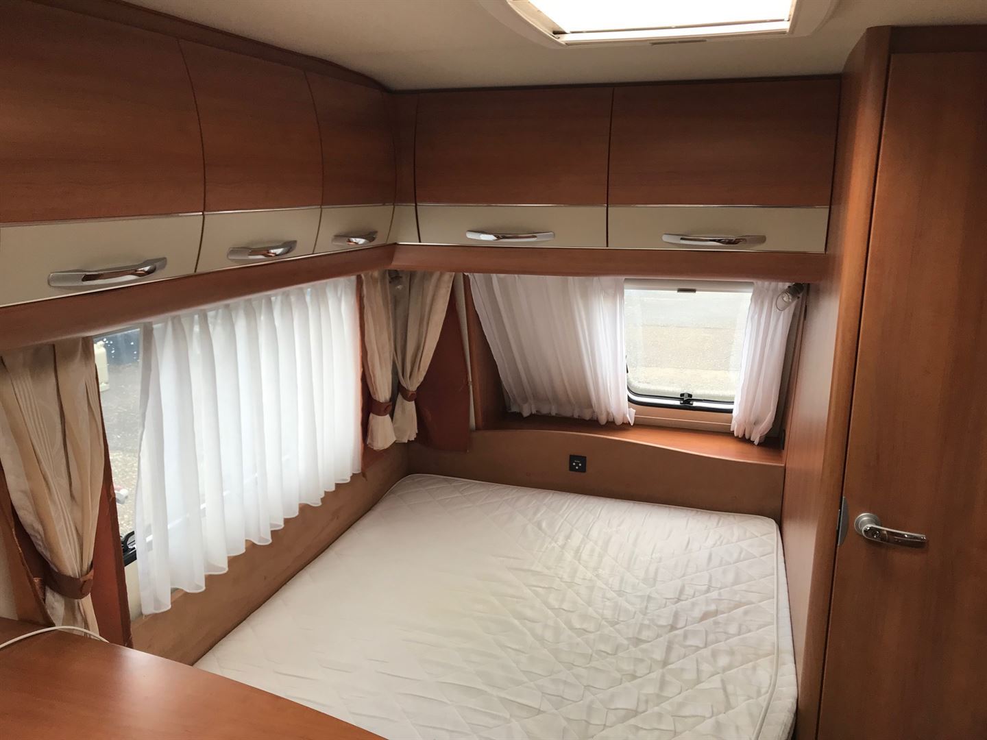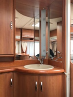 Boční rozkládací sezení, francouzská postel, kuchyň, WC se sklopným umyvadlem