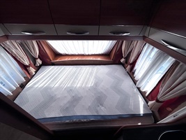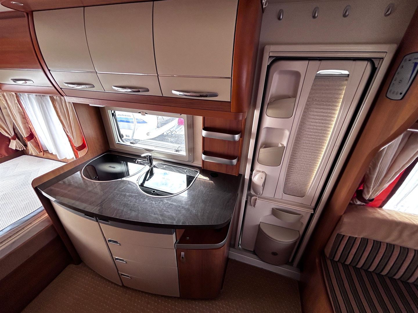 Rozkládací sezení ve tvaru U, velká francouzská postel, kuchyň, WC s umyvadlem a sprchovou vaničkou
