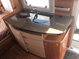 Rozkládací sezení do ,,U", velká francouzská postel, kuchyň, WC s umyvadlem a sprchovou vaničkou