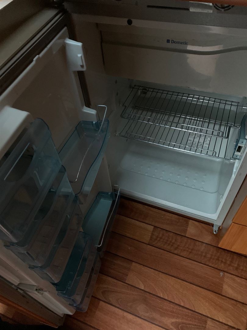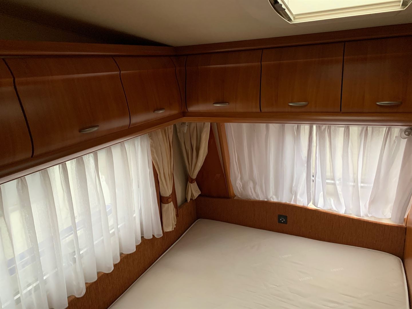 Velké rozkládací sezení ve tvaru U, velká francouzská postel, kuchyň, WC se sprchou, toaletní koutek