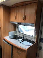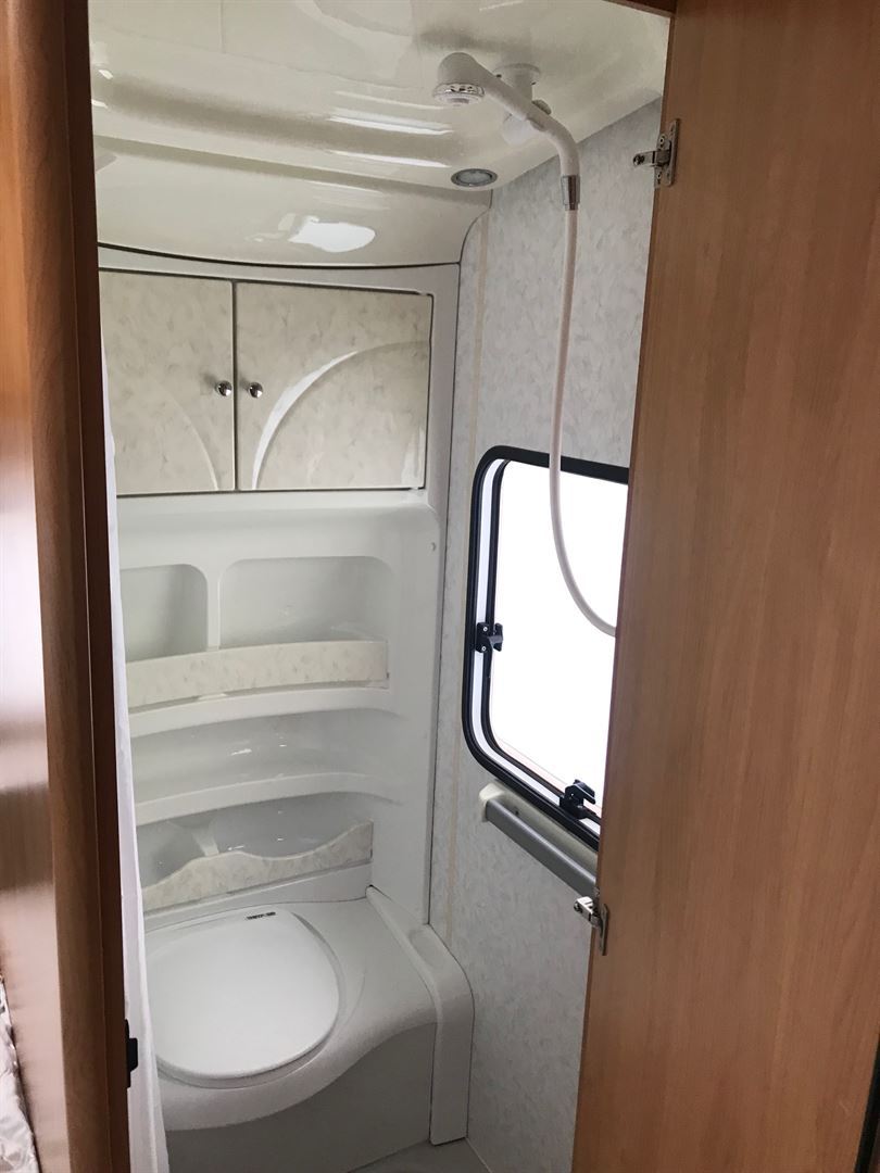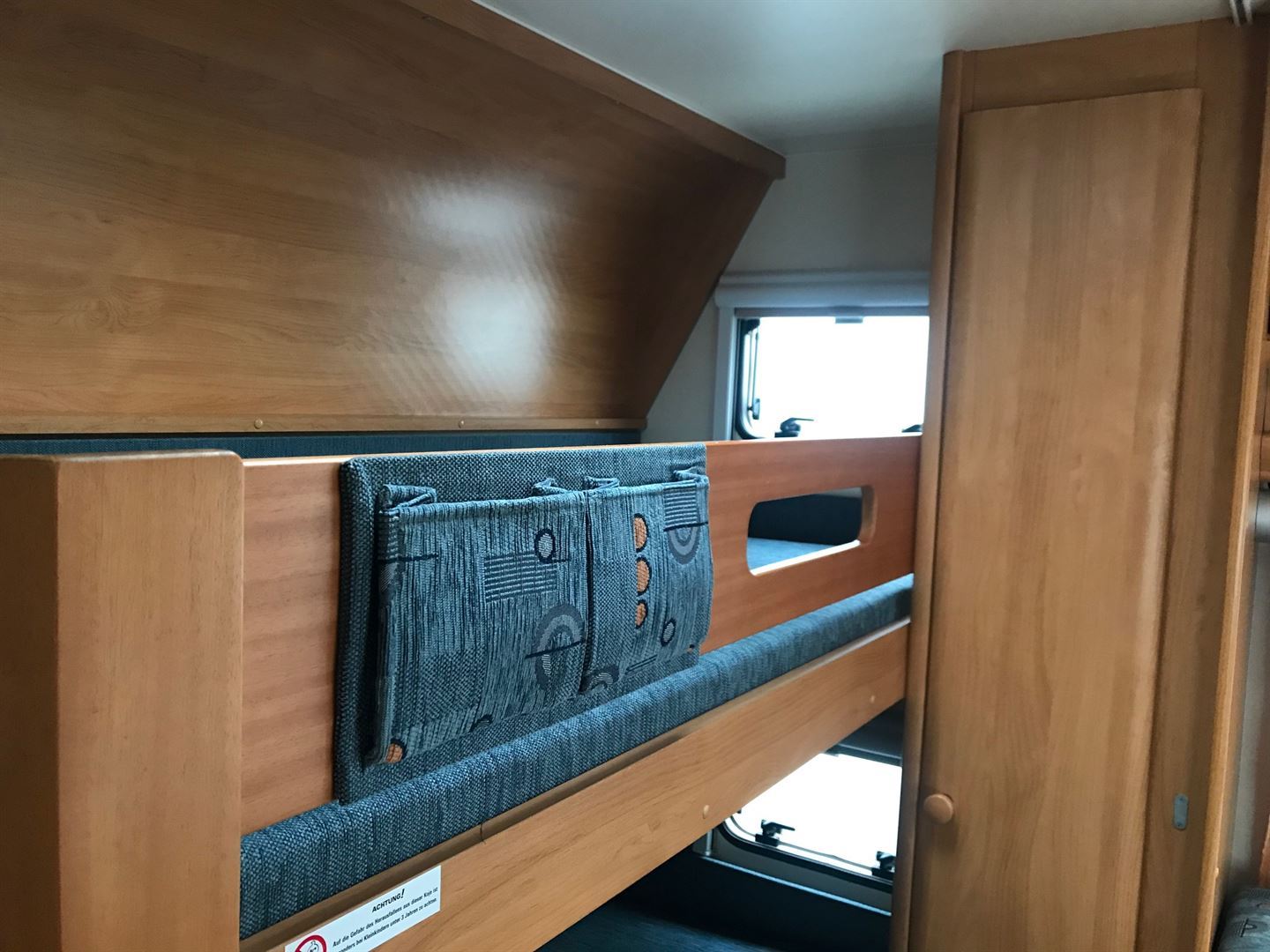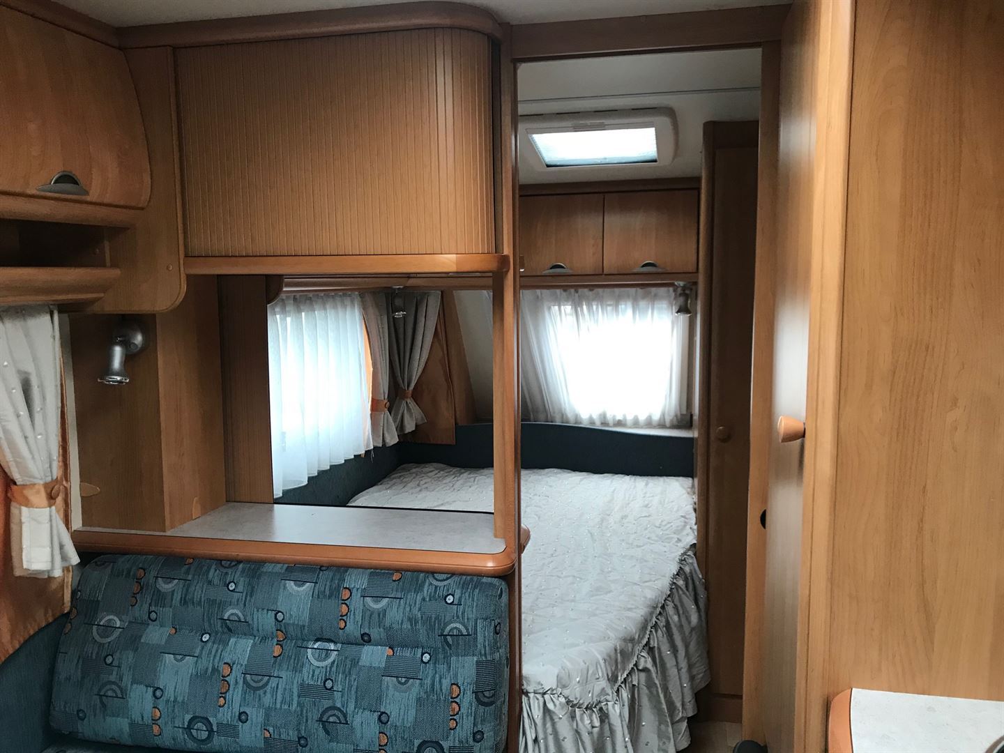 Rozkládací boční sezení, velká francouzská postel, palandy, kuchyň, WC se sprchou, toaletní koutek
