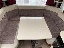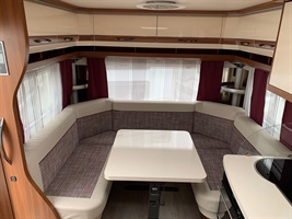 Velké rozkládací sezení ve tvaru U, dvě oddělené postele - uprostřed vysouvací rošt pro vytvoření velkého letiště, kuchyň, WC s umyvadlem