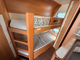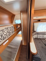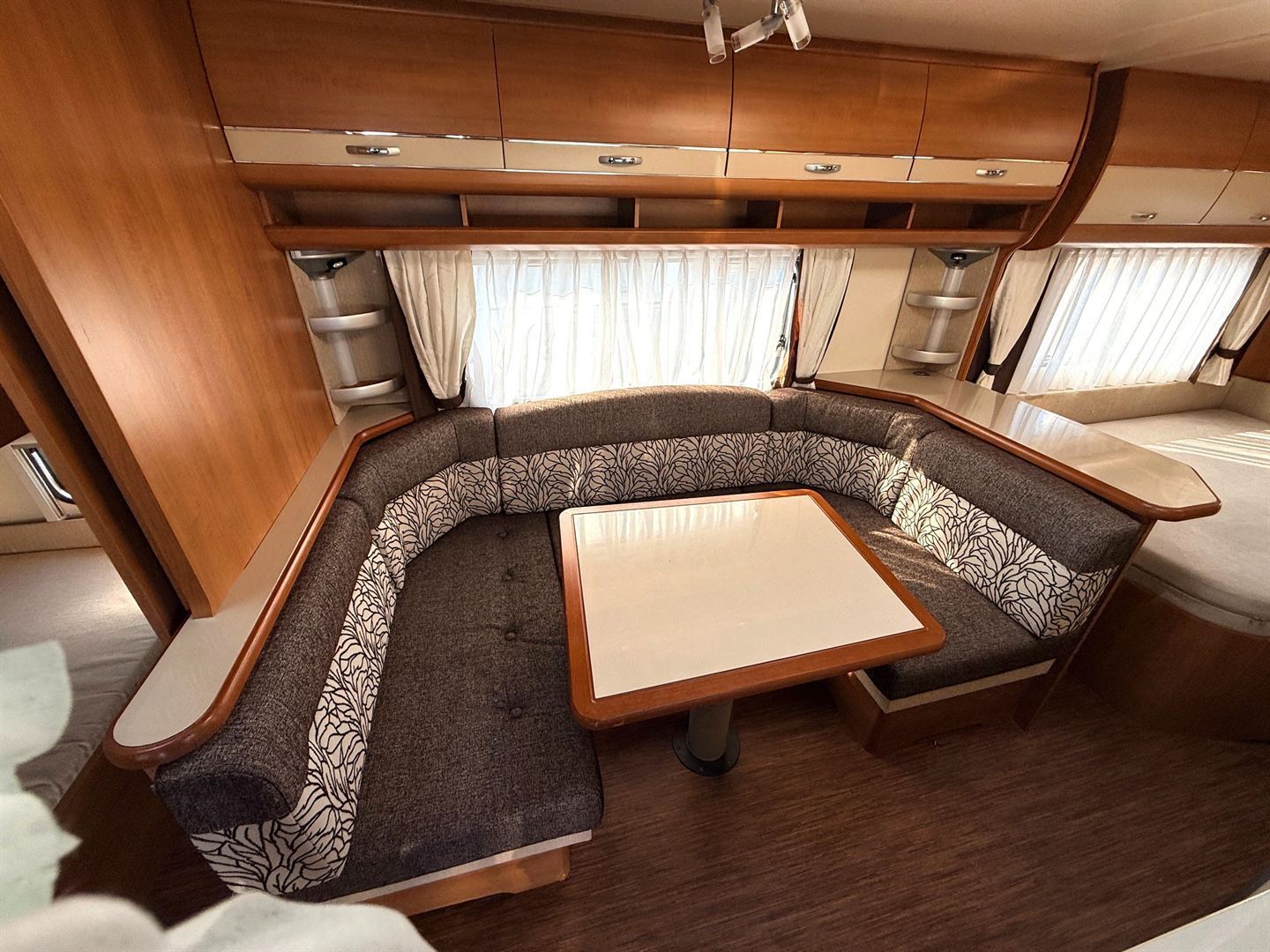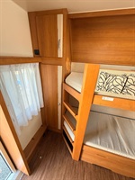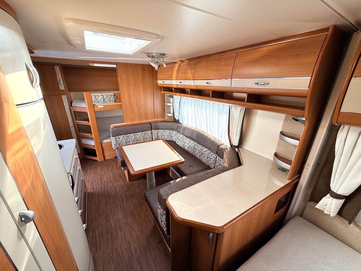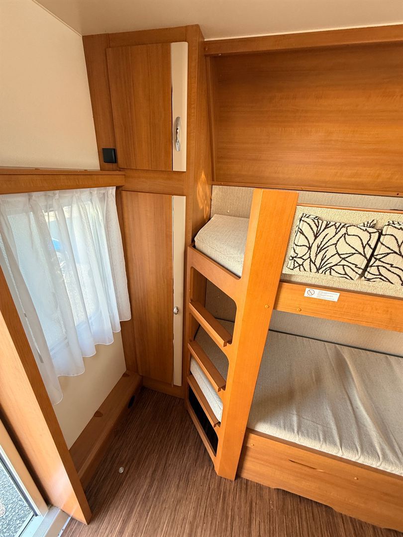 Velké rozkládací sezení ve tvaru U, francouzská postel, palandy s žebříkem, kuchyň, WC se SPRCHOU, toaletní koutek - umyvadlo zvlášť
