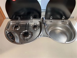 Velké dvoulůžko - královská manželská postel, obrovské rozkládací sezení ve tvaru U, otočná TV skříňka s barem, WC s umyvadlem a sprchovou vaničkou.