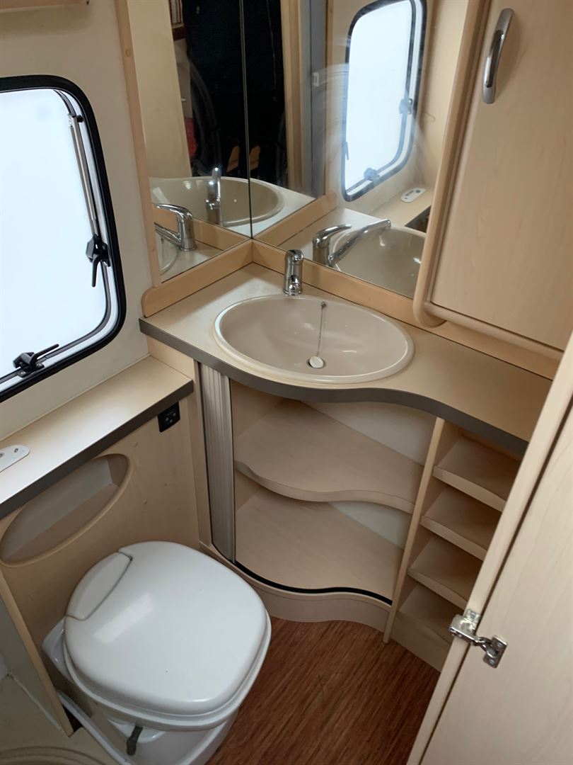 Rozkládací sezení ve tvaru U, velká francouzská postel, palandy, kuchyň, WC, umyvadlo, samostatná sprcha