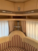 Velké rozkládací sezení ve tvaru U, francouzská postel, kuchyň, WC se sprchou, toaletní koutek
