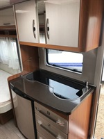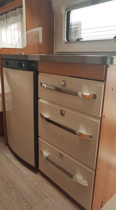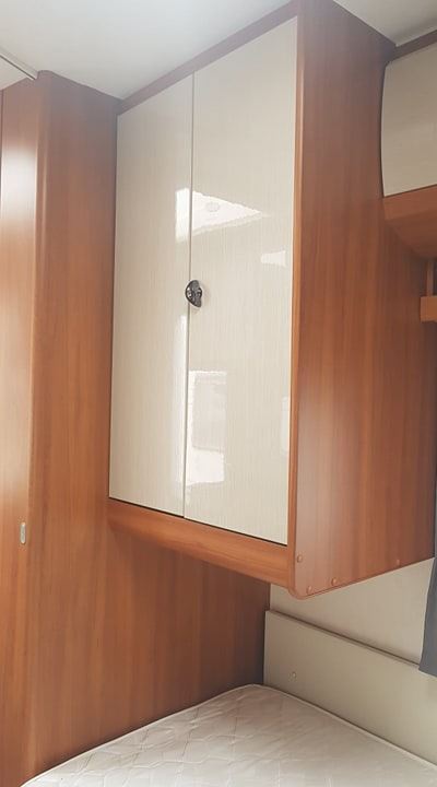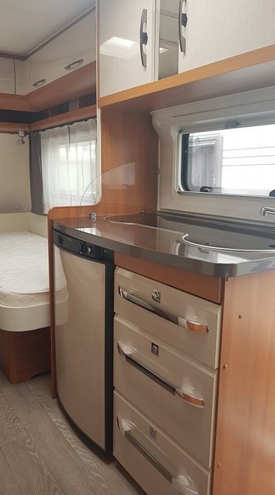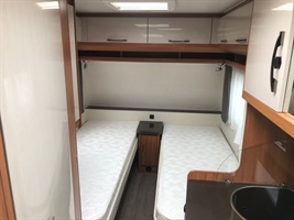 Rozkládací boční sezení, dvě oddělené postele (možnost dokoupení roštu pro vytvoření velkého letiště), kuchyň, WC s umyvadlem
