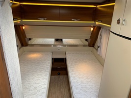 Velké rozkládací sezení ve tvaru U, dvě oddělené postele - uprostřed vysouvací rošt pro vytvoření velkého letiště, kuchyň, WC s umyvadlem