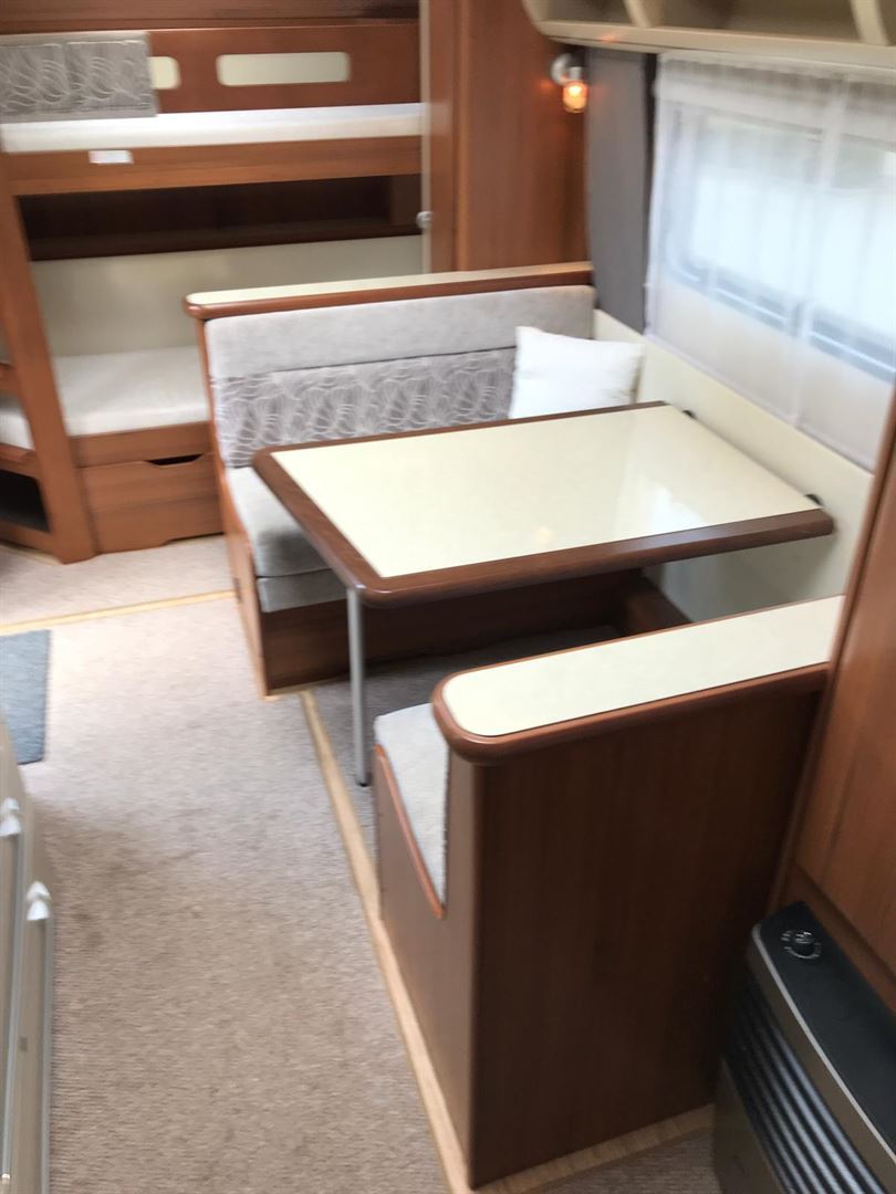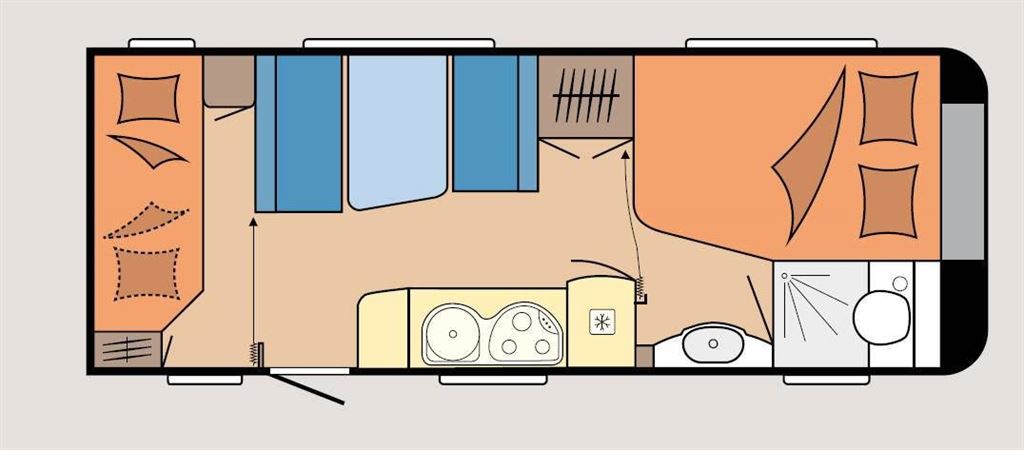 Rozkládací boční sezení, velká francouzská postel, palandy, kuchyň, WC se sprchou, umyvadlo zvlášť.