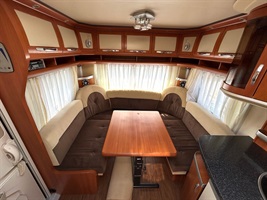 Velké rozkládací sezení ve tvaru U, velká francouzská postel, kuchyň, WC se sprchou, umyvadlo zvlášť