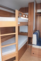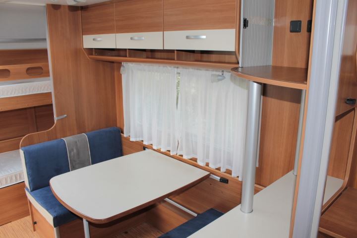 Rozkládací boční sezení, velká francouzská postel, palandy, kuchyň, WC se sprchou, umyvadlo zvlášť.