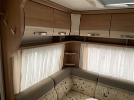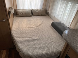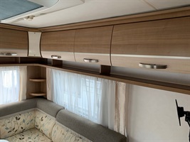 Velké rozkládací sezení ve tvaru U, francouzská postel, kuchyň, WC se sprchou, umyvadlo zvlášť.