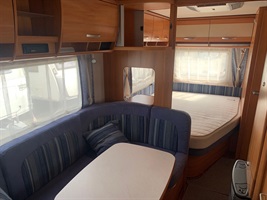 Rozkládací sezení ve tvaru U, velká francouzská postel, palandy, kuchyň, WC se sprchou, toaletní koutek