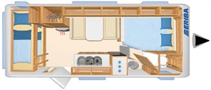 Rozkládací boční sezení, francouzská postel, velká palanda, kuchyň, WC se sprchovou vaničkou, umyvadlo zvlášť
