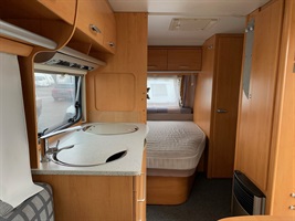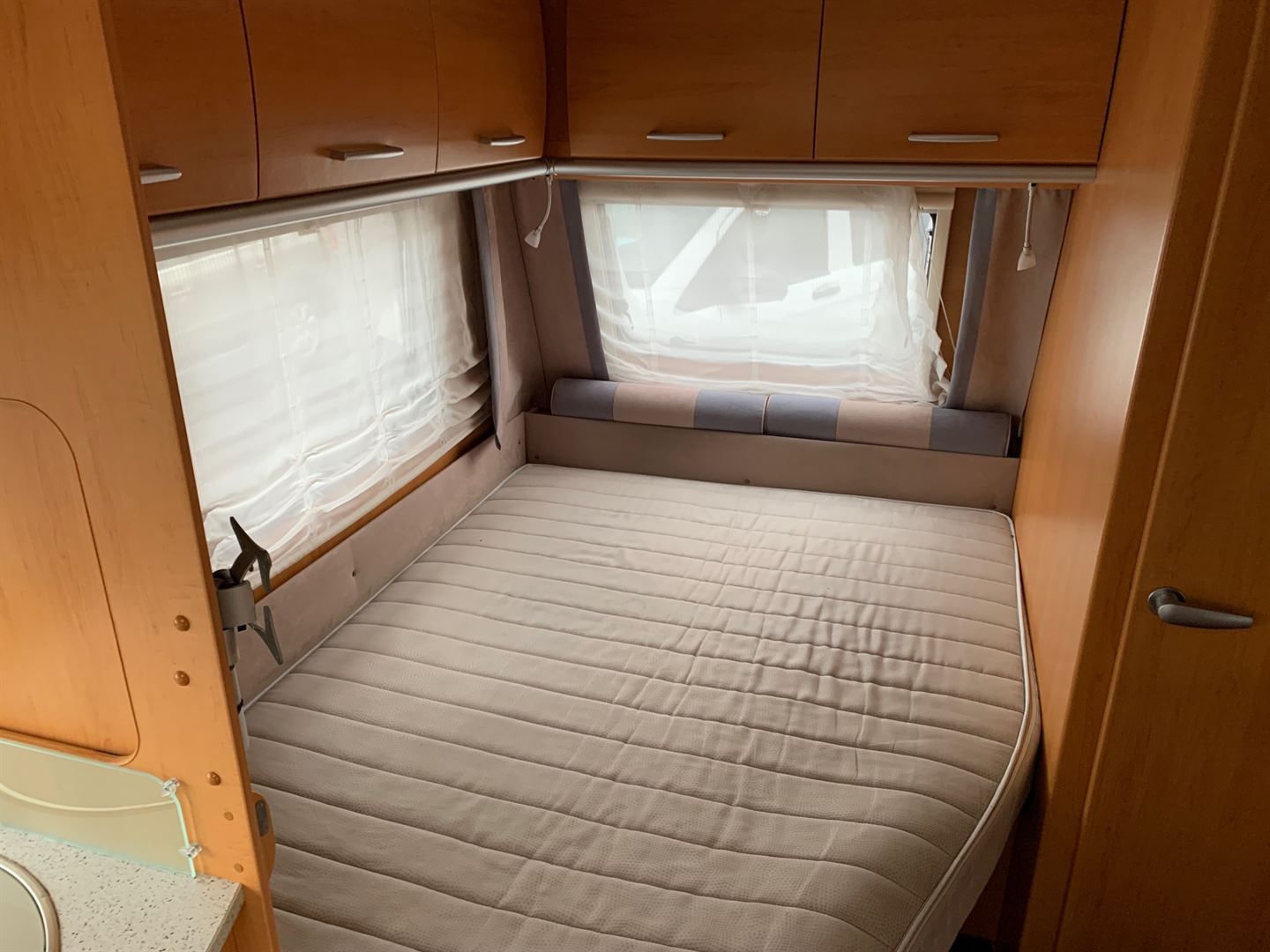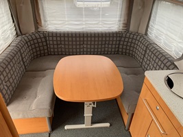 Velké rozkládací sezení ve tvaru U, francouzská postel, kuchyň, WC se sprchovou vaničkou a držákem na sprchovou baterii, umyvadlo zvlášť.
