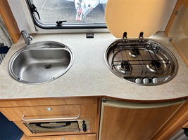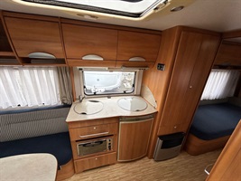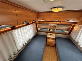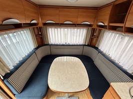 Rozkládací sezení do ,,U", dvě oddělené postele - možnost dokoupení roštu pro vytvoření velkého letiště, kuchyň, WC s umyvadlem