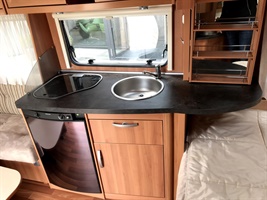 Velké rozkládací sezení ve tvaru U, francouzská postel, kuchyň, WC, toaletní koutek