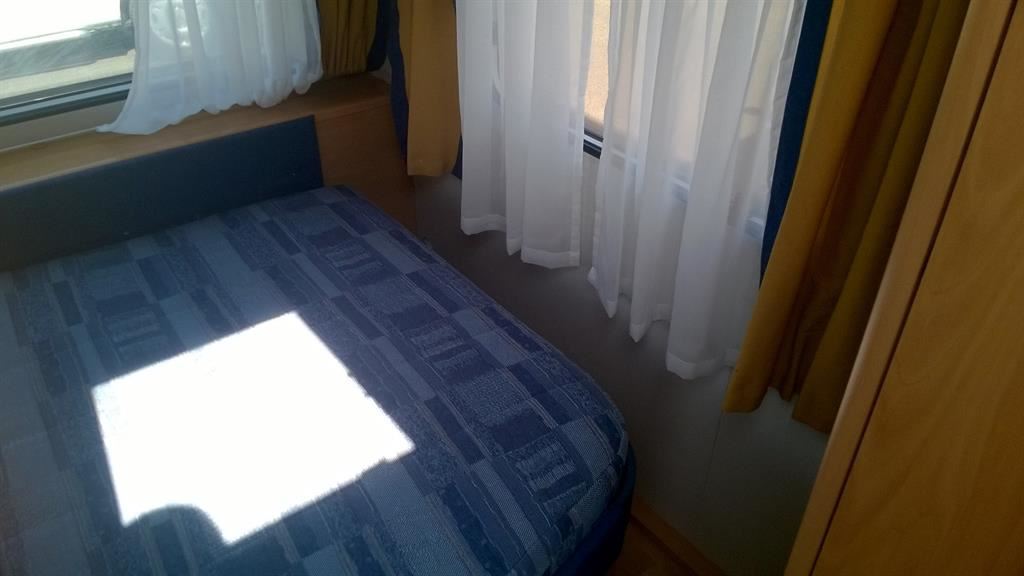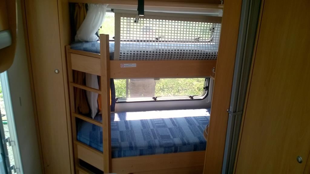 Rozkládací boční sezení, velká francouzská postel, palandy, kuchyň, WC s umyvadlem.