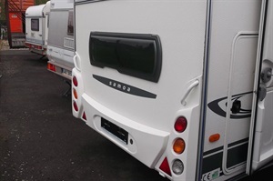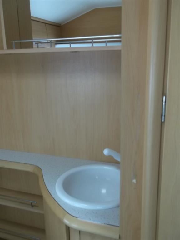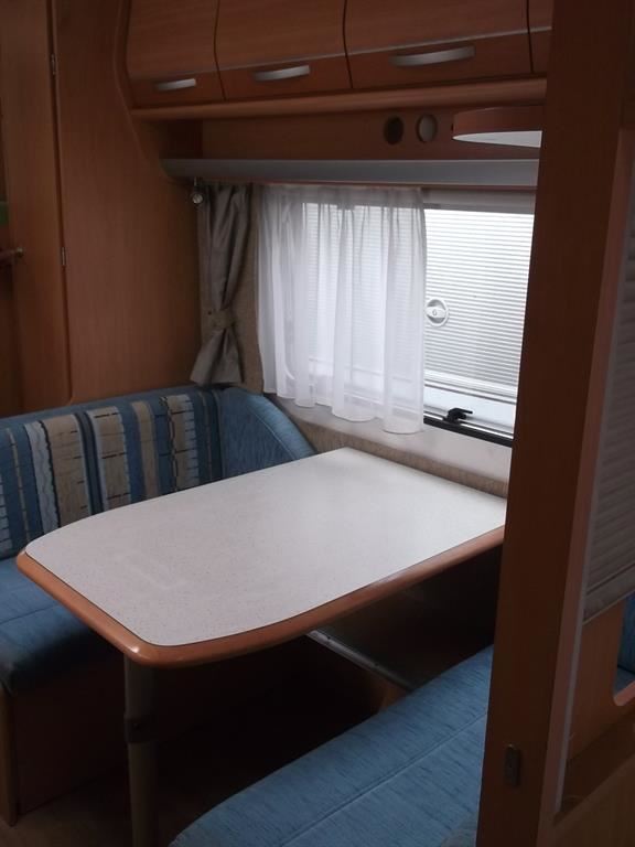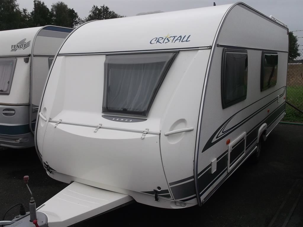 Karavan Cristal Samoa 480, palandy, zadní garáž, středové sezení, vepředu francouzská postel, WC s umyvadlem zvlášť, bojler ,pevná nádrž na vodu, lednice 12/220V/, nerez. plyn. vařič a dřez, topení s rozfukem, okna s roletkami a síťkami poroti hmyzu, střešní držák antény, drobná opotřebení