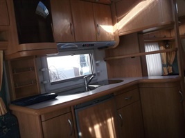 rozkládací sezení do U,fr.postel 4-5 x spaní,lednice 12/220V/plyn,bojler,topení s rozfukem,