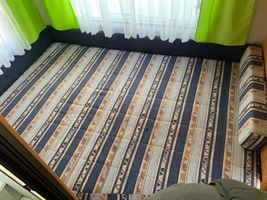 Velké rozkládací sezení ve tvaru U, velká francouzská postel, kuchyň, WC se sprchou, toaletní koutek