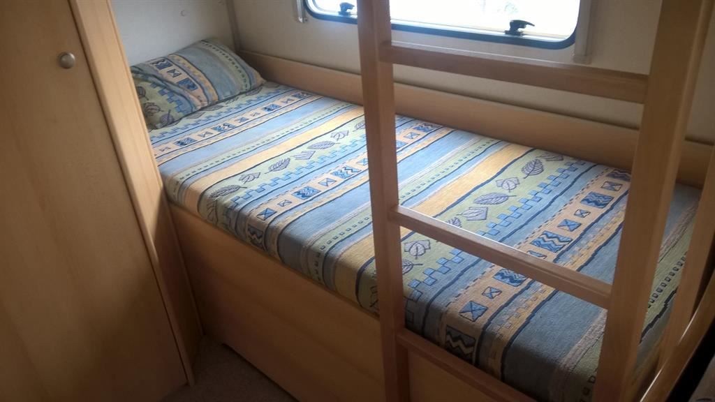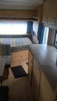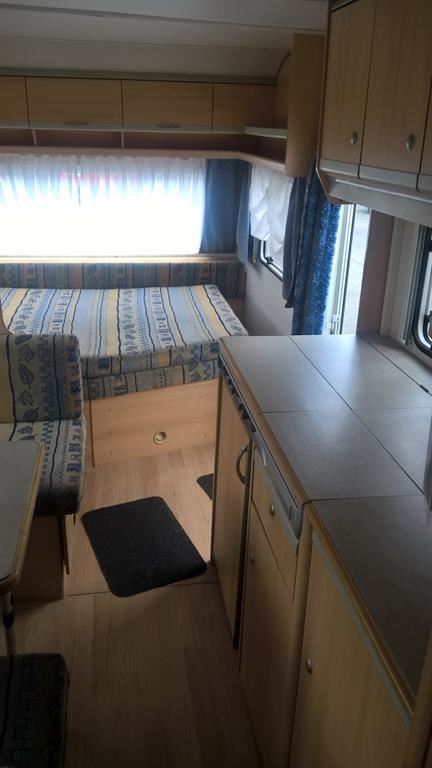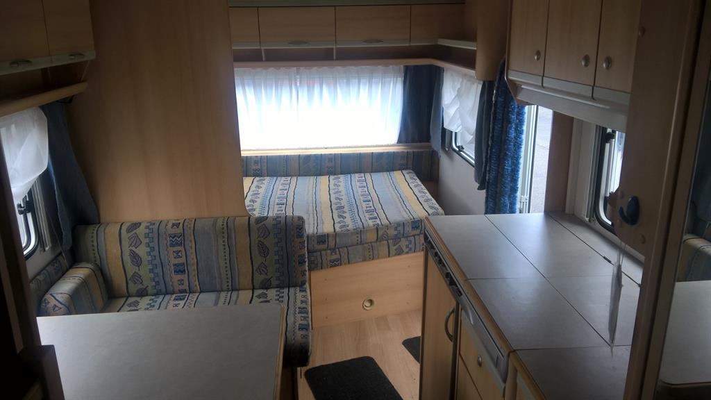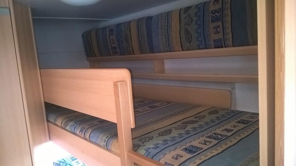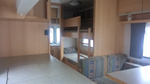 Rozkládací boční sezení, velká francouzská postel, palandy, kuchyň, WC se sprchou, umyvadlo zvlášť.