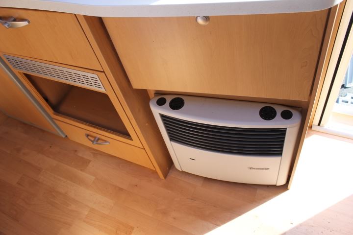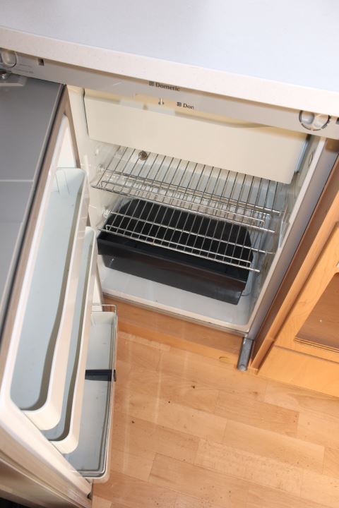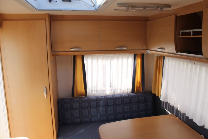 Rozkládací boční sezení, velká francouzská postel, kuchyň, WC s umyvadlem a sprchovou vaničkou.