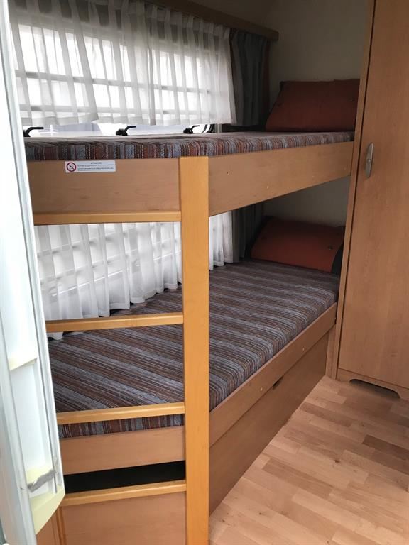 Rozkládací sezení do ,,U", francouzská postel, velká palanda se žebříkem, kuchyň, WC s umyvadlem a sprchou