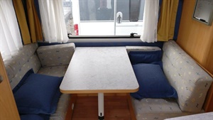 Rozkládací boční sezení, manželská postel, kuchyň, WC s umyvadlem