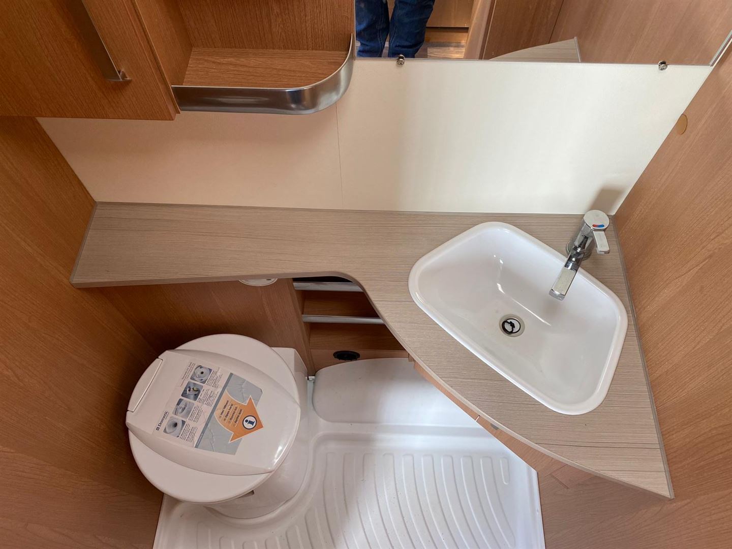 Boční rozkládací sezení, dvě oddělené postele - uprostřed vysouvací rošt pro vytvoření velkého letiště, kuchyň, WC s umyvadlem