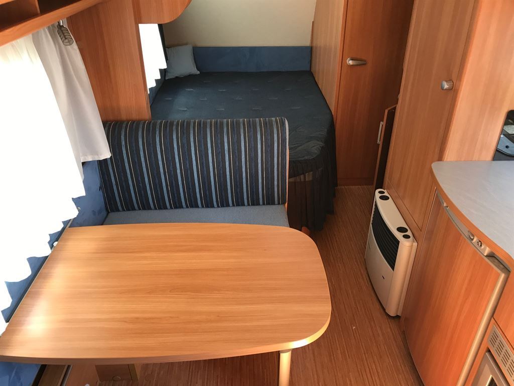 Boční rozkládací sezení, francouzská postel, velká palanda se žebříkem, kuchyň, WC se sprchou, umyvadlo zvlášť