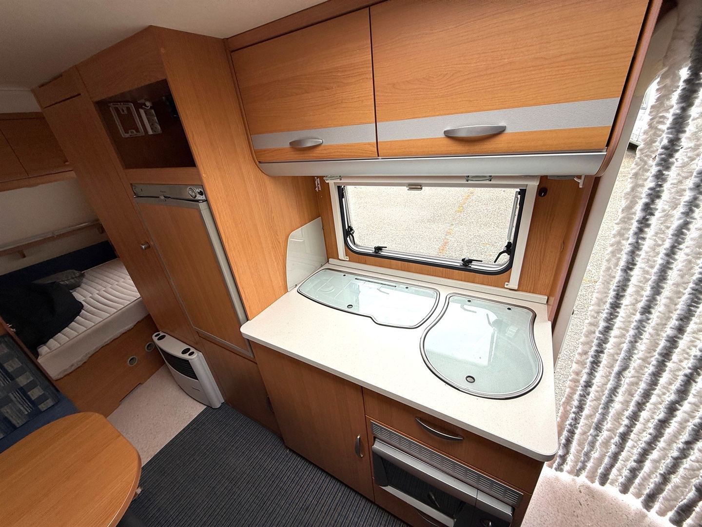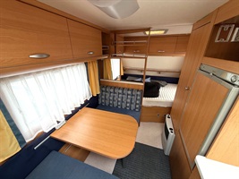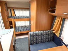 Boční rozkládací sezení, francouzská postel, velké palandy se žebříkem, kuchyň, WC s umyvadlem