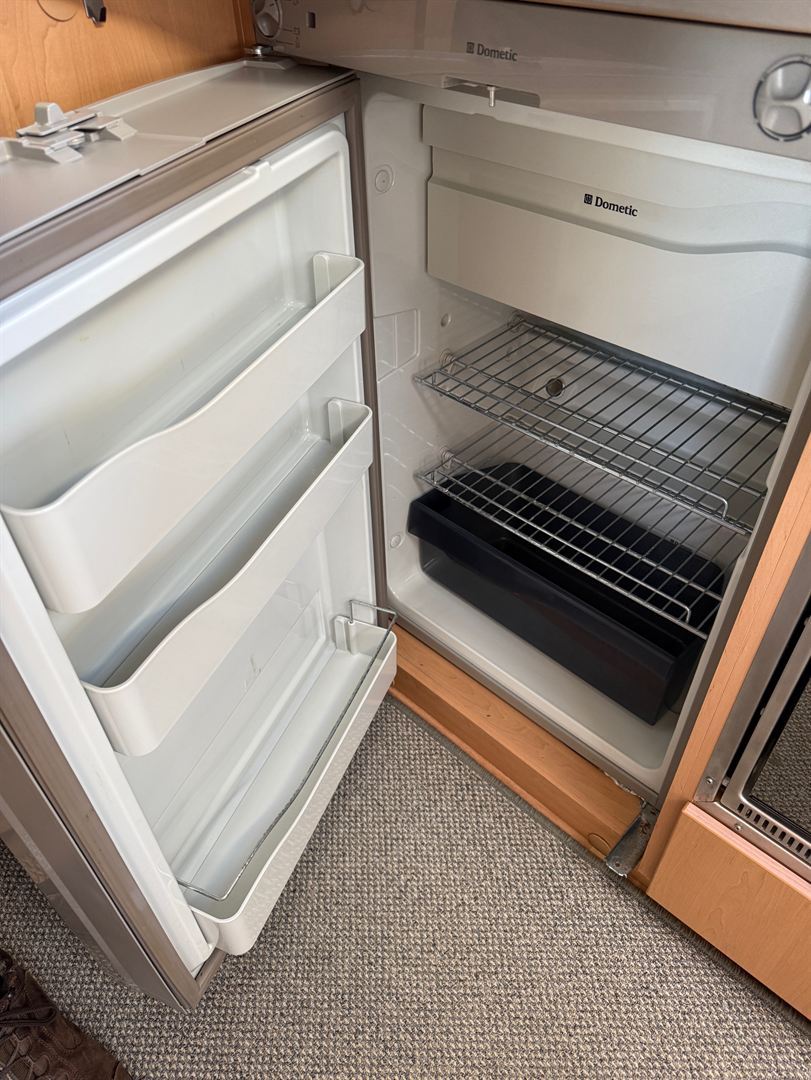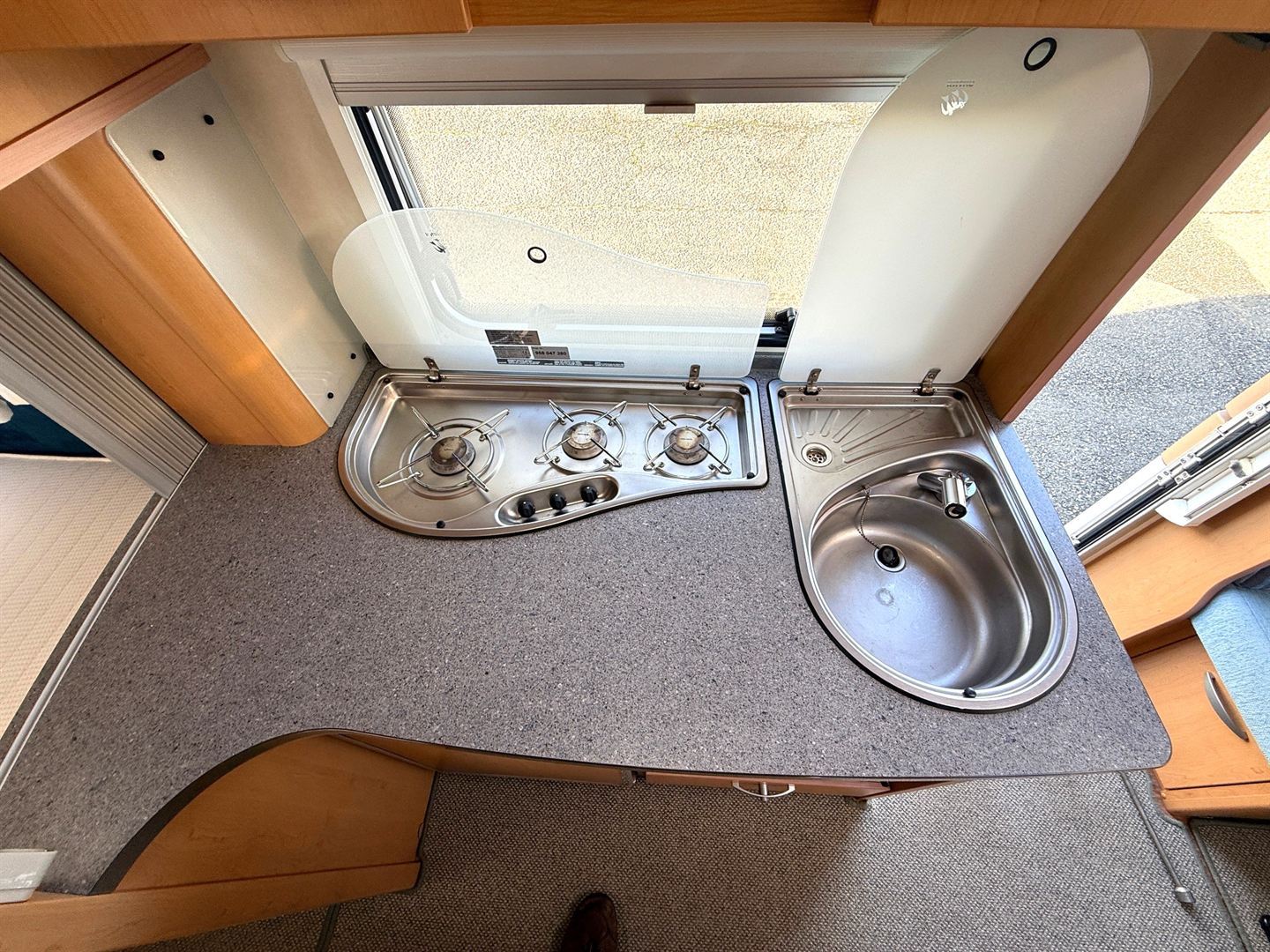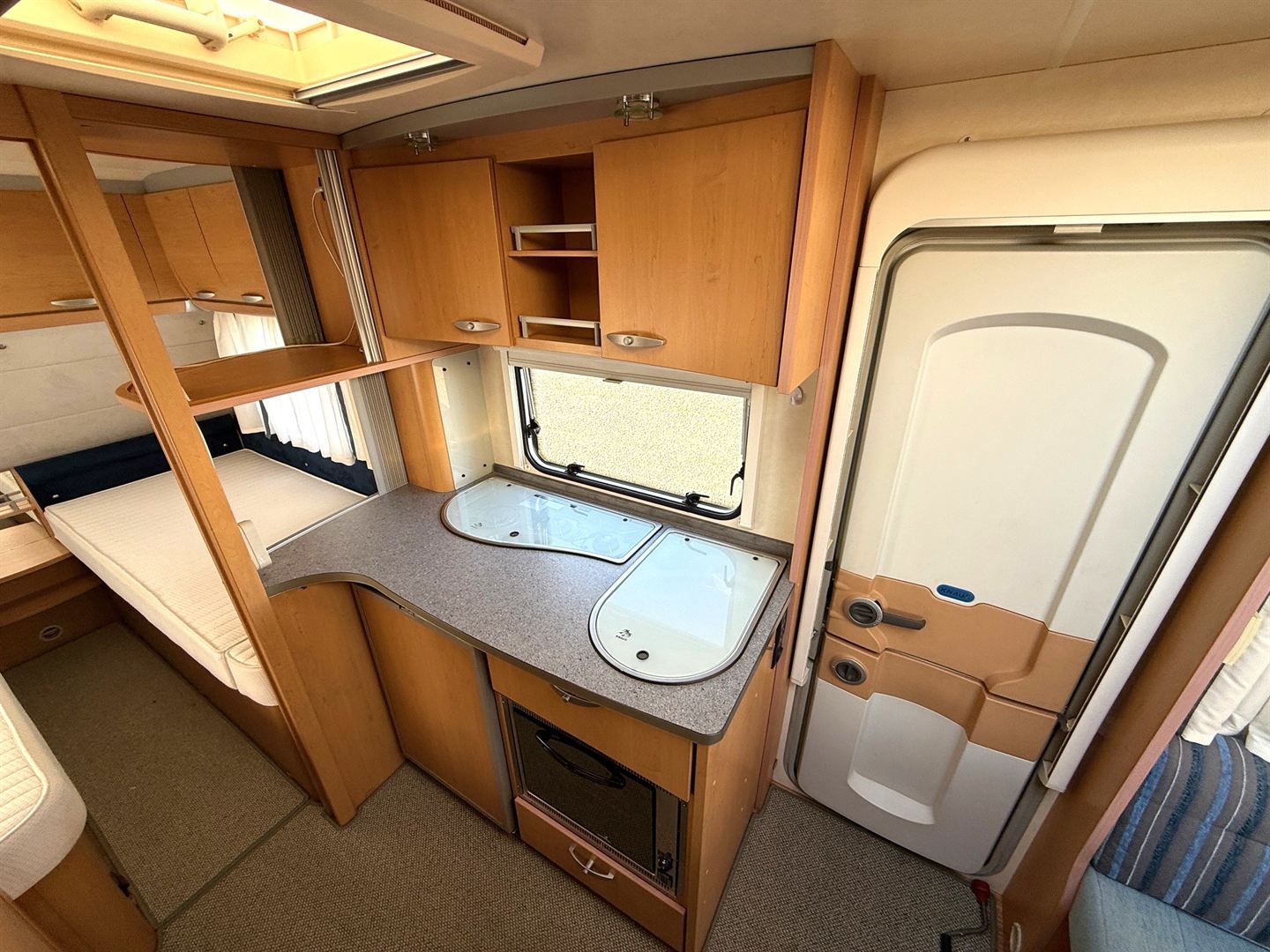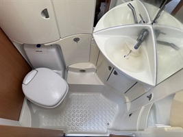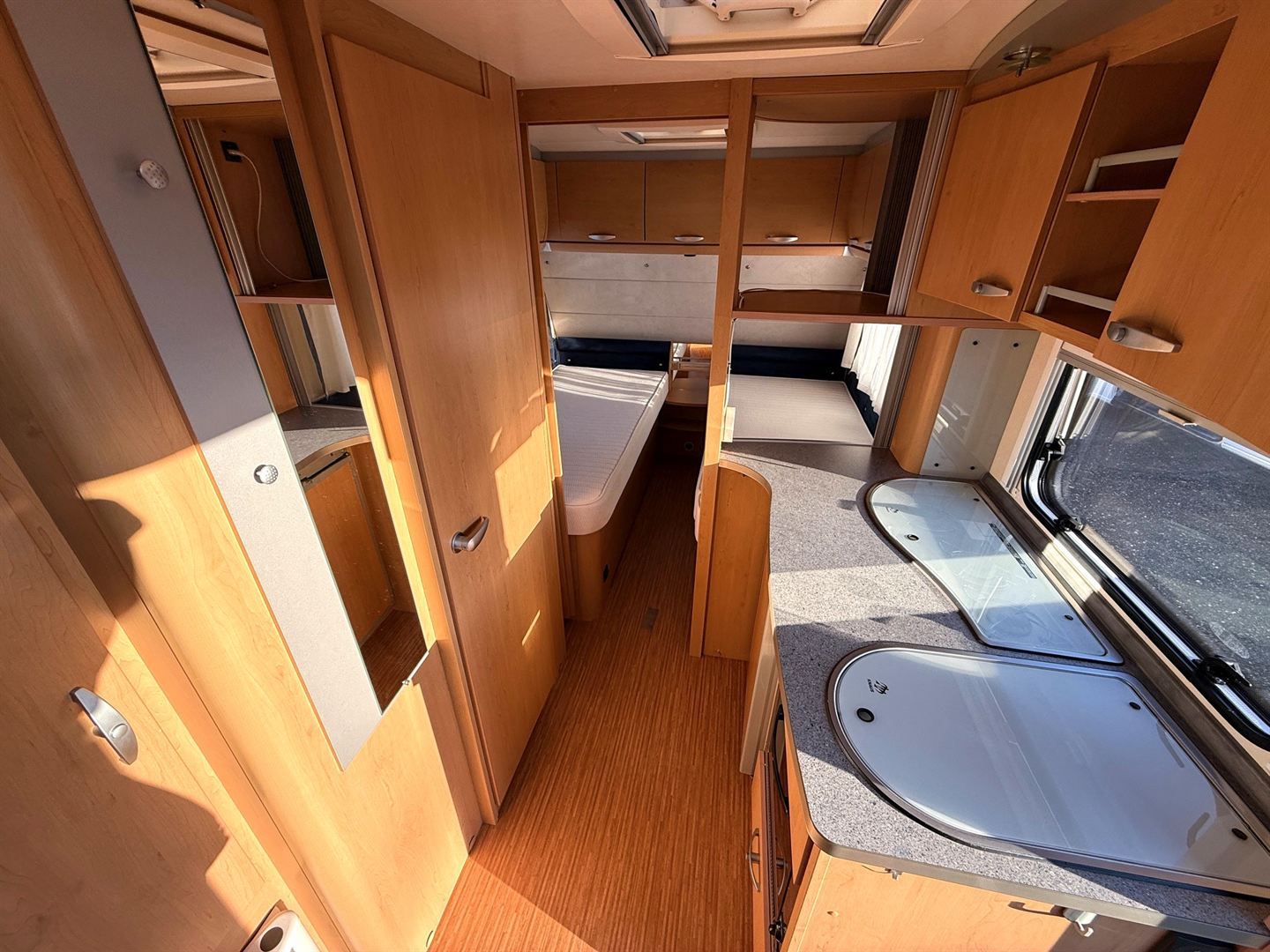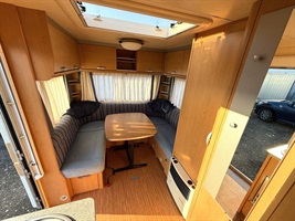 Velké rozkládací sezení ve tvaru U, velká francouzská postel, kuchyň, WC se sprchou a sprchovou vaničkou, toaletní koutek